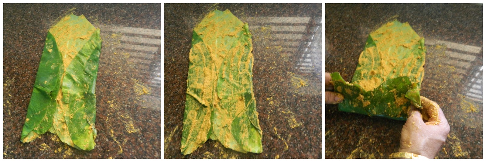 - Again place one more leaf to the centre if the leaf is small and smear the masala well.