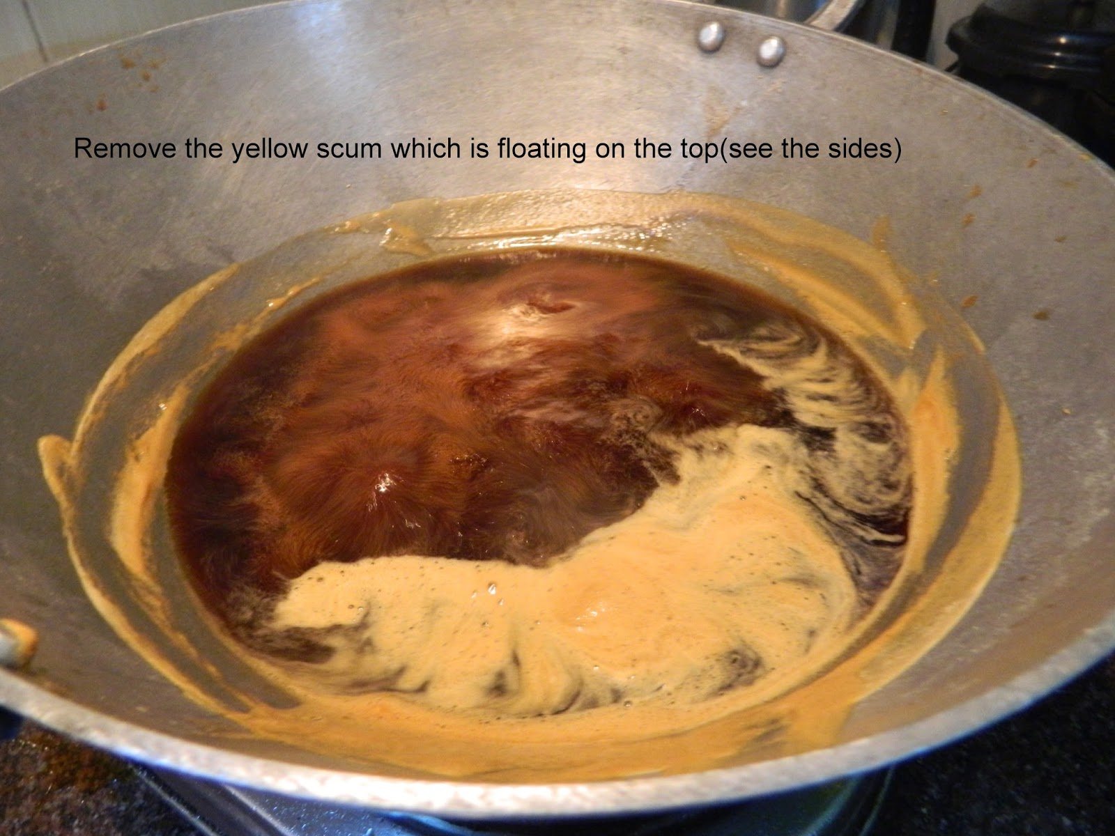 - Remove any yellow scum like thing which floats over the top of the syrup since it is the impurities present in the jaggery.